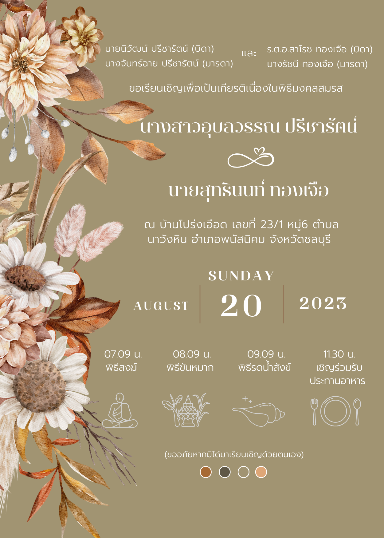ณ บ้านโปร่งเอือด เลขที่ ๒๓/๑ หมู่ ๖ ตำบลนาวังหิน อำเภอพนัสนิคม จังหวัดชลบุรี